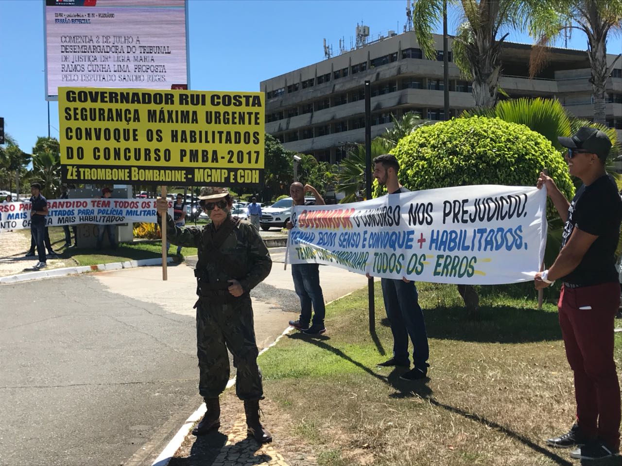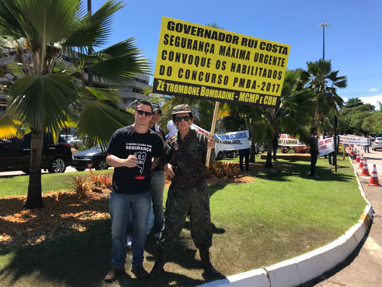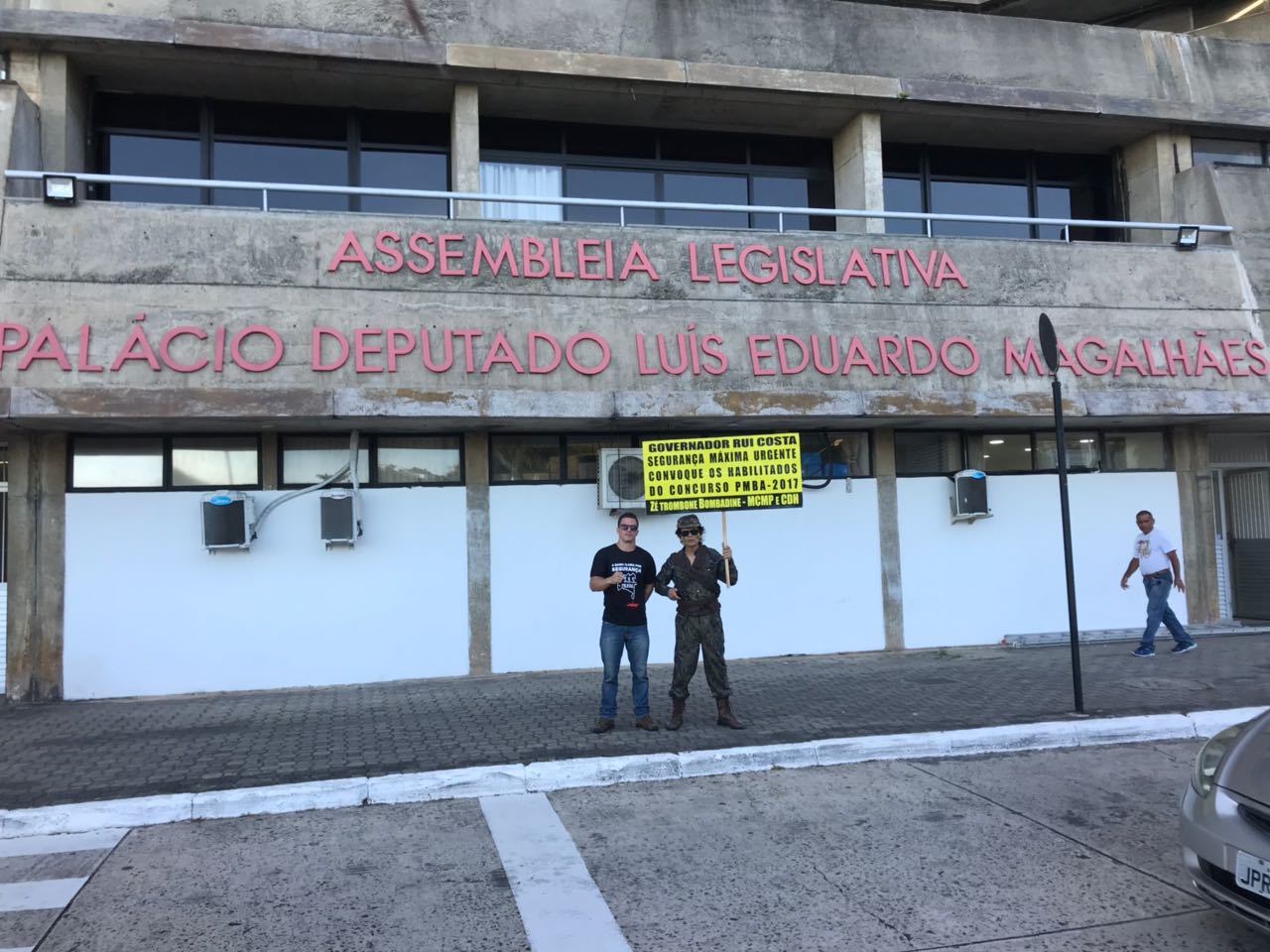 Nesta Terça, a partir das 13:00 hs, na Assembleia Legislativa da Bahia, ocorreu uma Manifestação de Habilitados no Concurso da PMBA – 2017, participando Zé Trombone Bombardine, personificado em André Cairo, Presidente do Movimento Contra a Morte Prematura, com uma Placa “Governador Rui Costa, Segurança Máxima Urgente, Convoque Habilitados do Concurso da PMBA-2017”; e da Comissão dos aprovados no referido Concurso, Nilson de Araújo, líder da referida Comissão, que entregaram em mãos do Sr. Marcos Palmeira, Assessor de Rui Costa, um Ofício CDH-VC-01/2018 devidamente protocolado, permanecendo até o final.