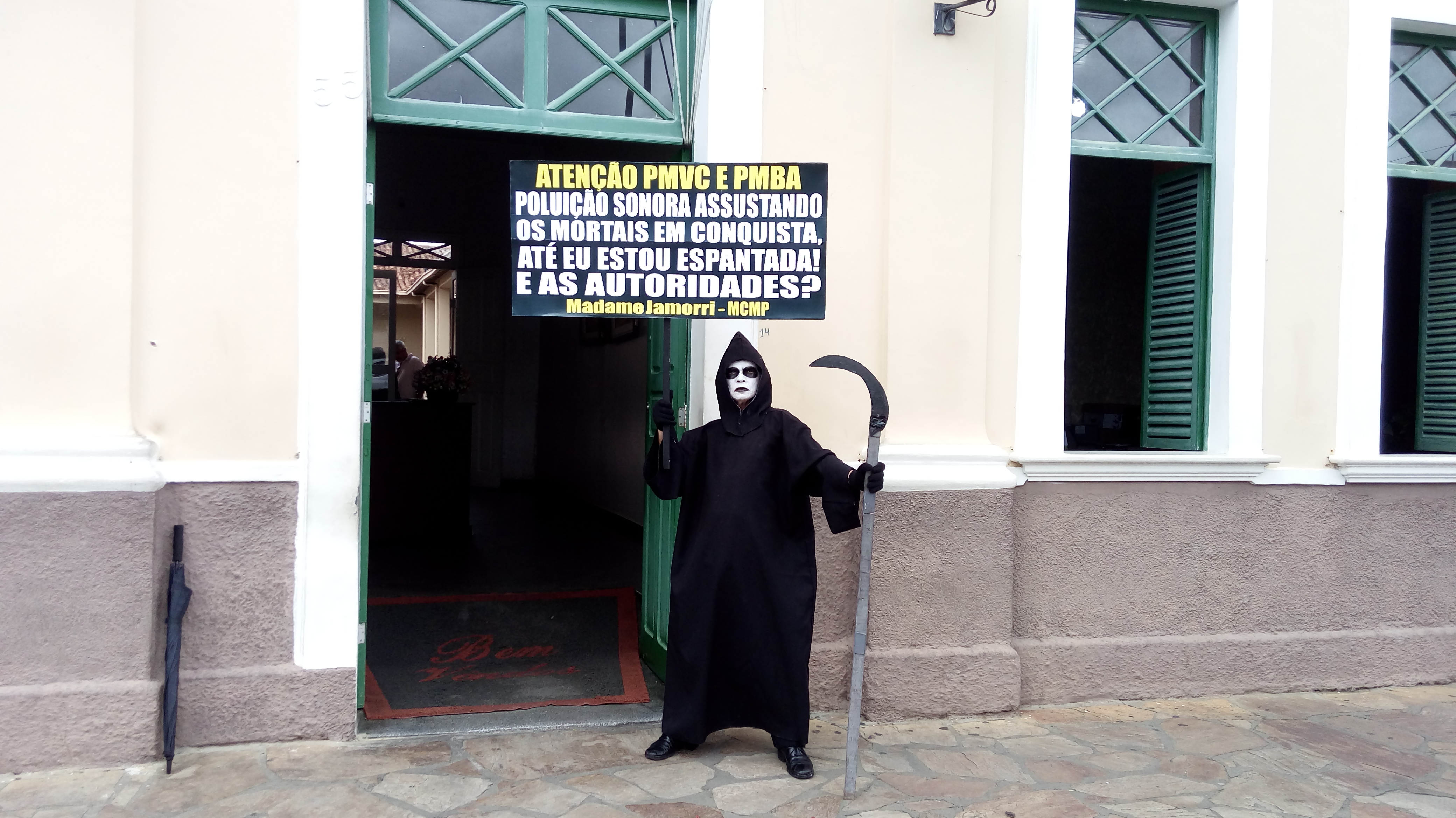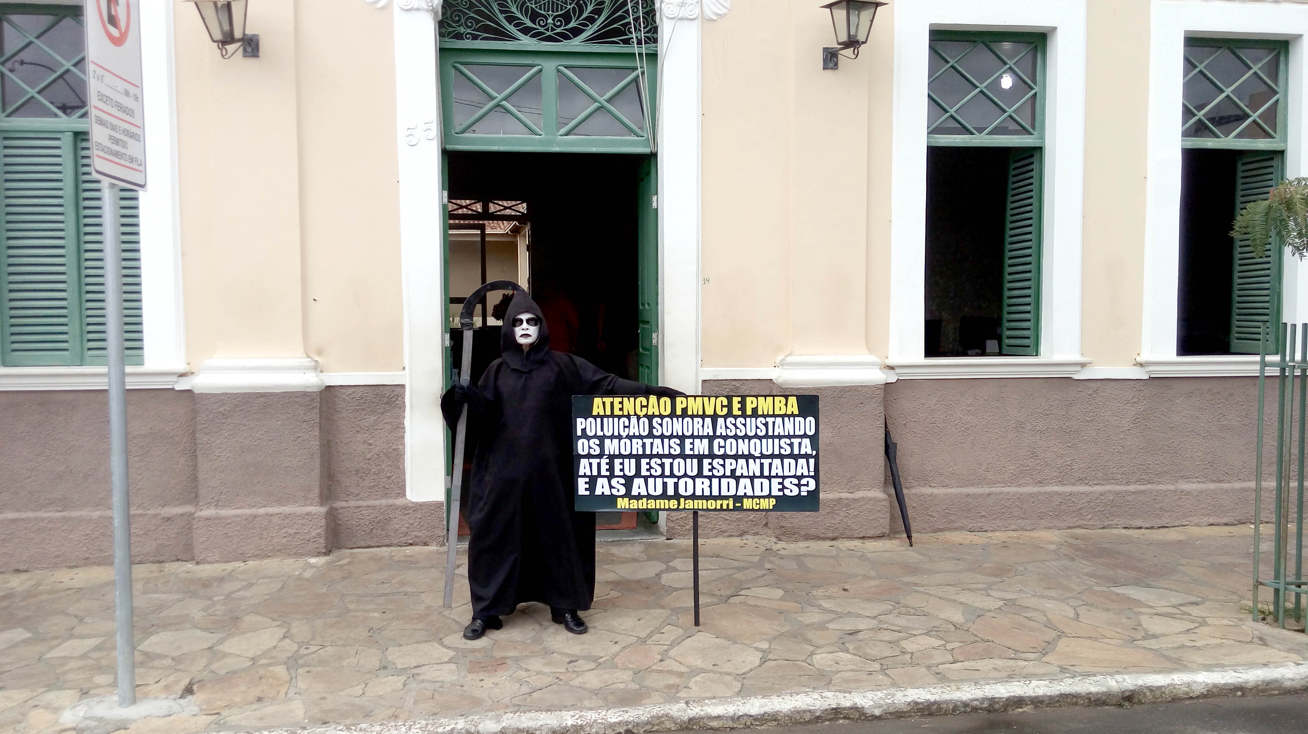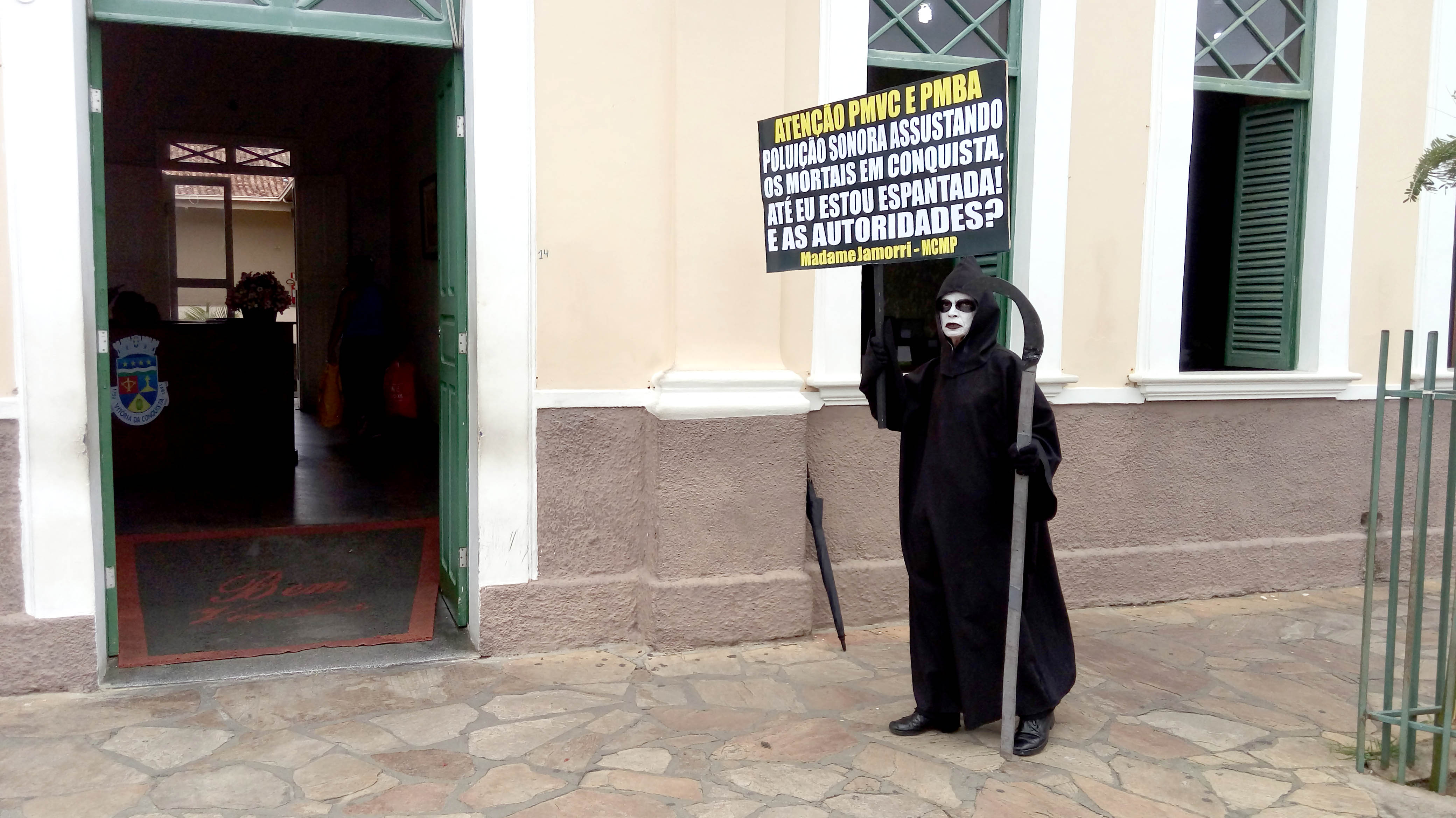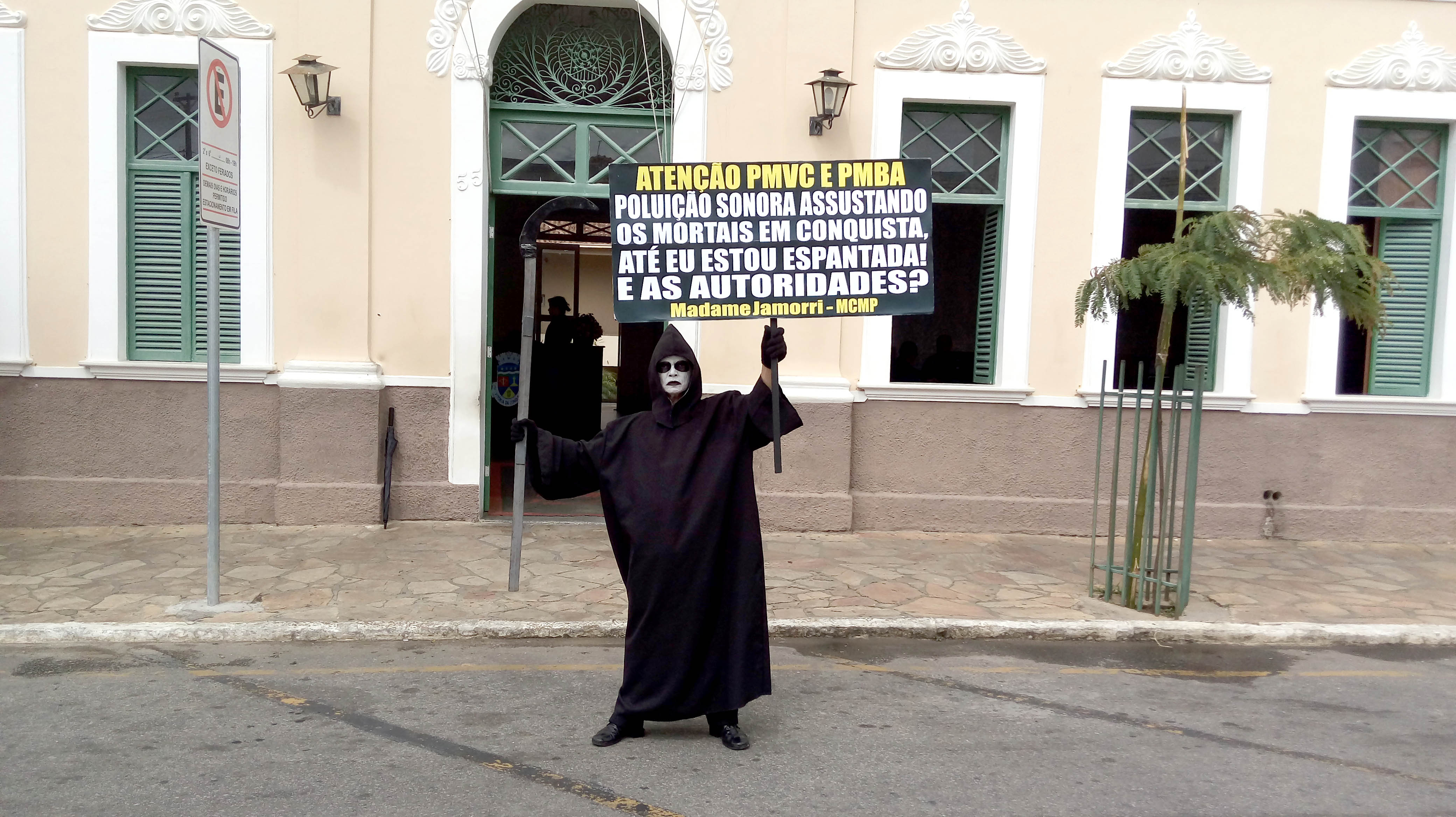 Questiona o Ambientalista e Presidente do Movimento Contra a Morte Prematura, André Cairo, em Protesto defronte a Prefeitura de Conquista, personificado de Madame Jamorri, espantada com tanto barulho na cidade, onde o MCMP cobra das Autoridades por mais de duas décadas, extinção de Perturbações do Sossego Público, em audiências com Prefeitos, Secretários, Ofícios, Tribuna Livre da Câmara, Manifestações, MP, Personagens e Imprensa, exigindo cumprimento das Leis em Eventos, Casas Noturnas, Veículos de duas e quatro rodas com sons estridentes e descargas livres ensurdecedoras, circulando livremente na cidade.