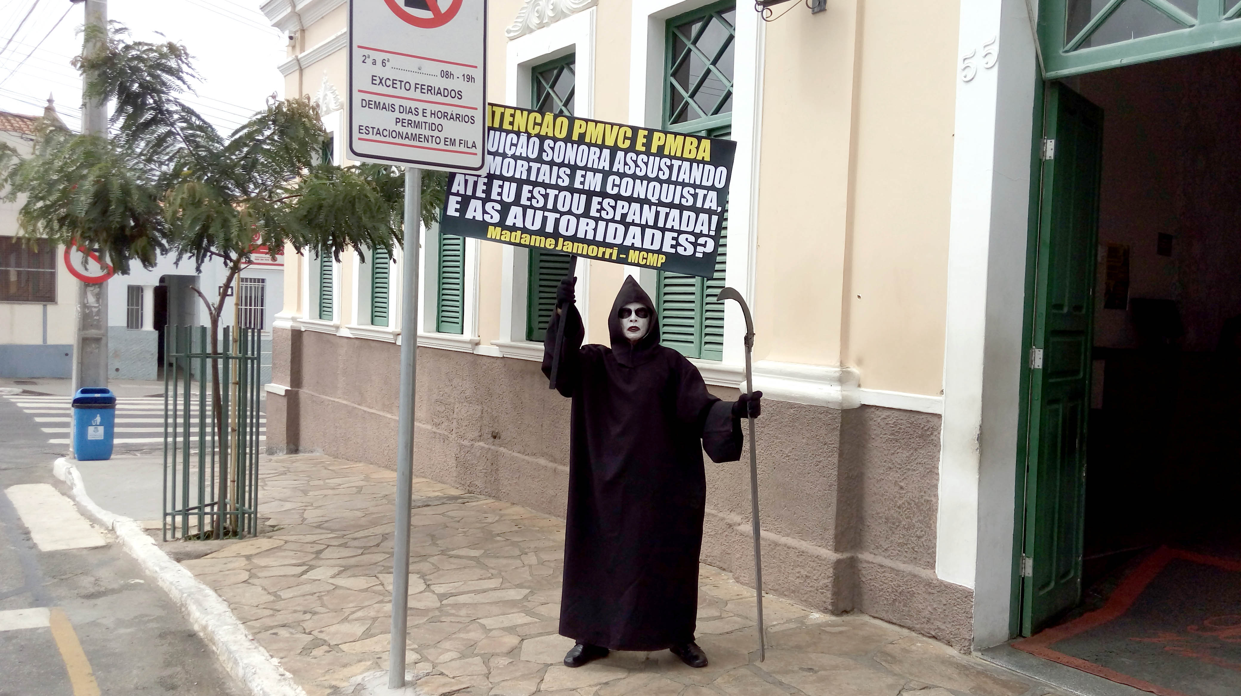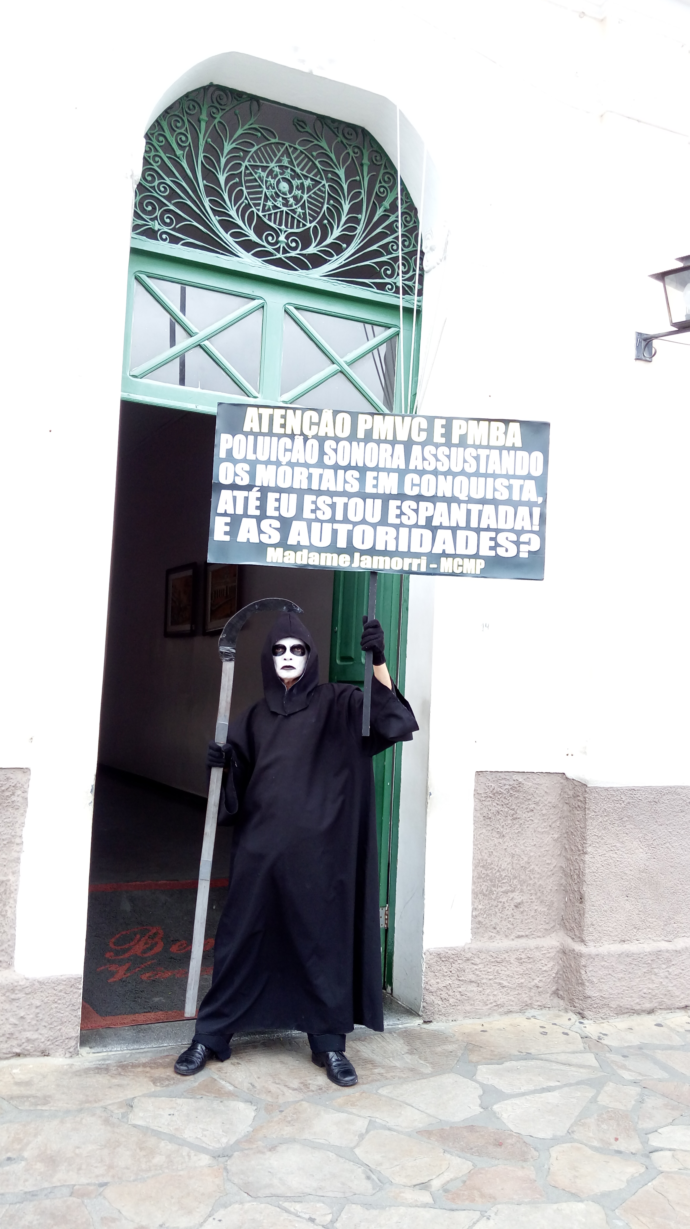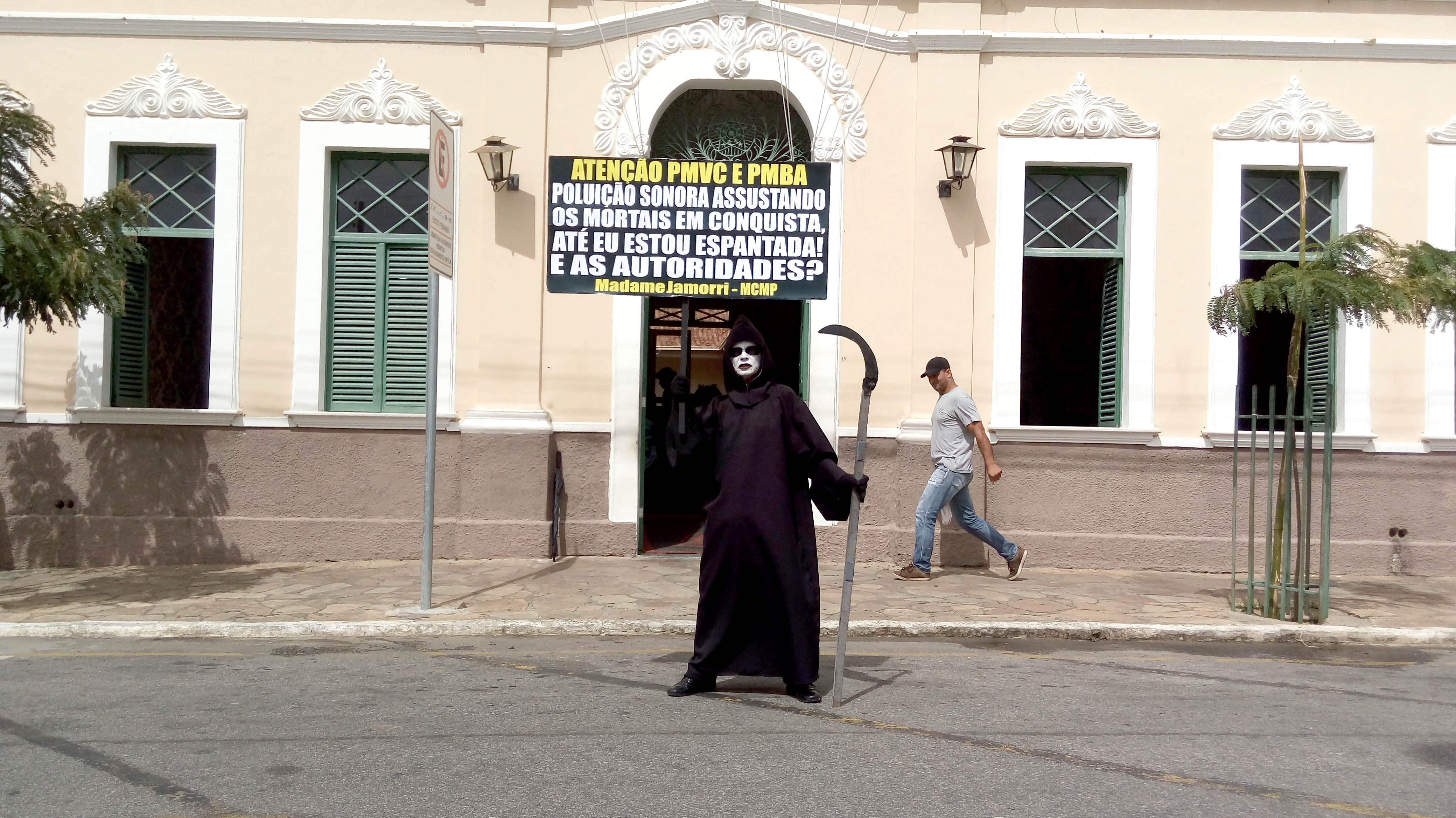 Questiona o Ambientalista e Presidente do Movimento Contra a Morte Prematura, André Cairo, em Protesto defronte a Prefeitura de Conquista, personificado de Madame Jamorri, espantada com tanto barulho na cidade, onde o MCMP cobra das Autoridades por mais de duas décadas, extinção de Perturbações do Sossego Público, em audiências com Prefeitos, Secretários, Ofícios, Tribuna Livre da Câmara, Manifestações, MP, Personagens e Imprensa, exigindo cumprimento das Leis em Eventos, Casas Noturnas, Veículos de duas e quatro rodas com sons estridentes e descargas livres ensurdecedoras, circulando livremente na cidade.