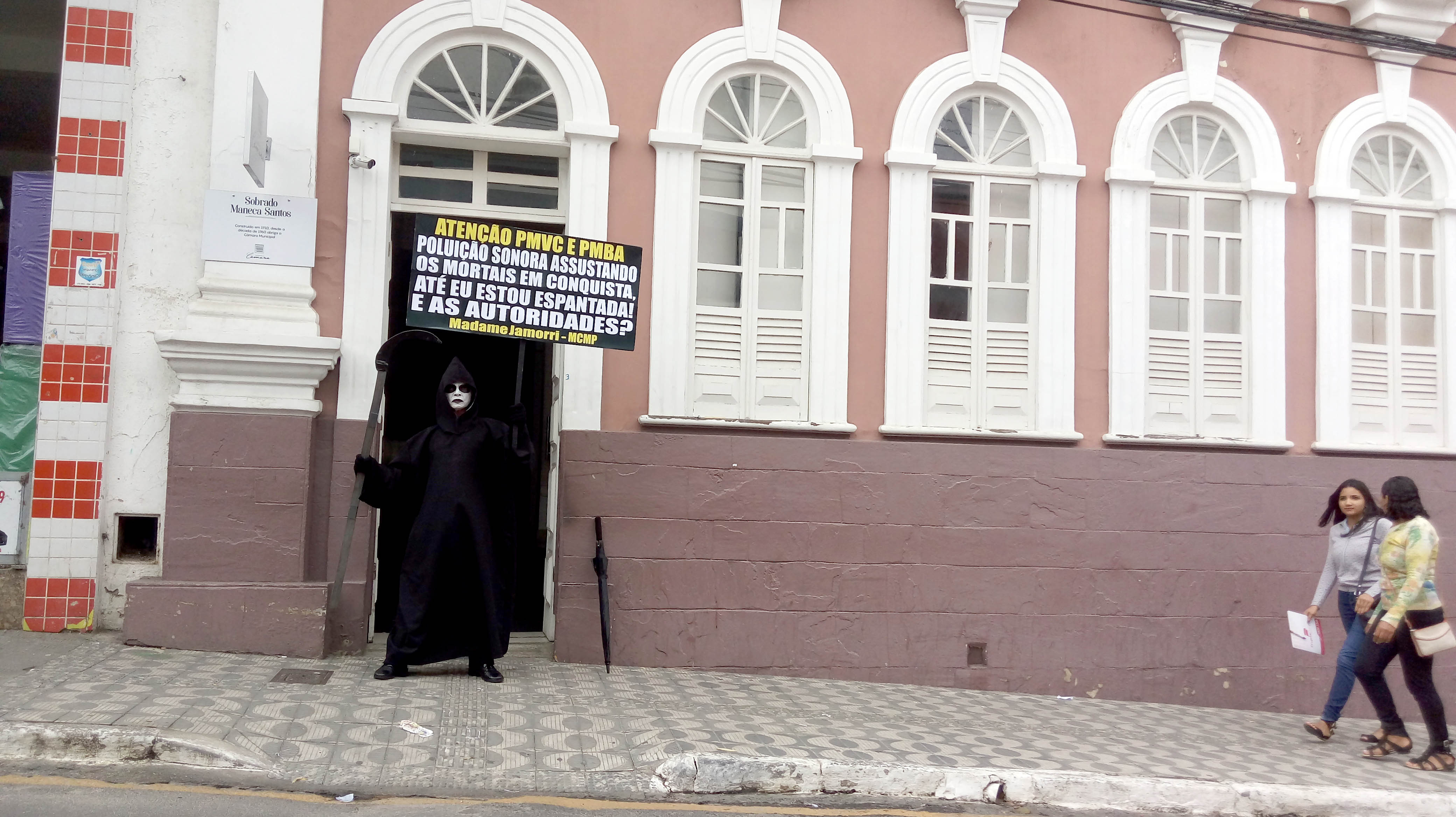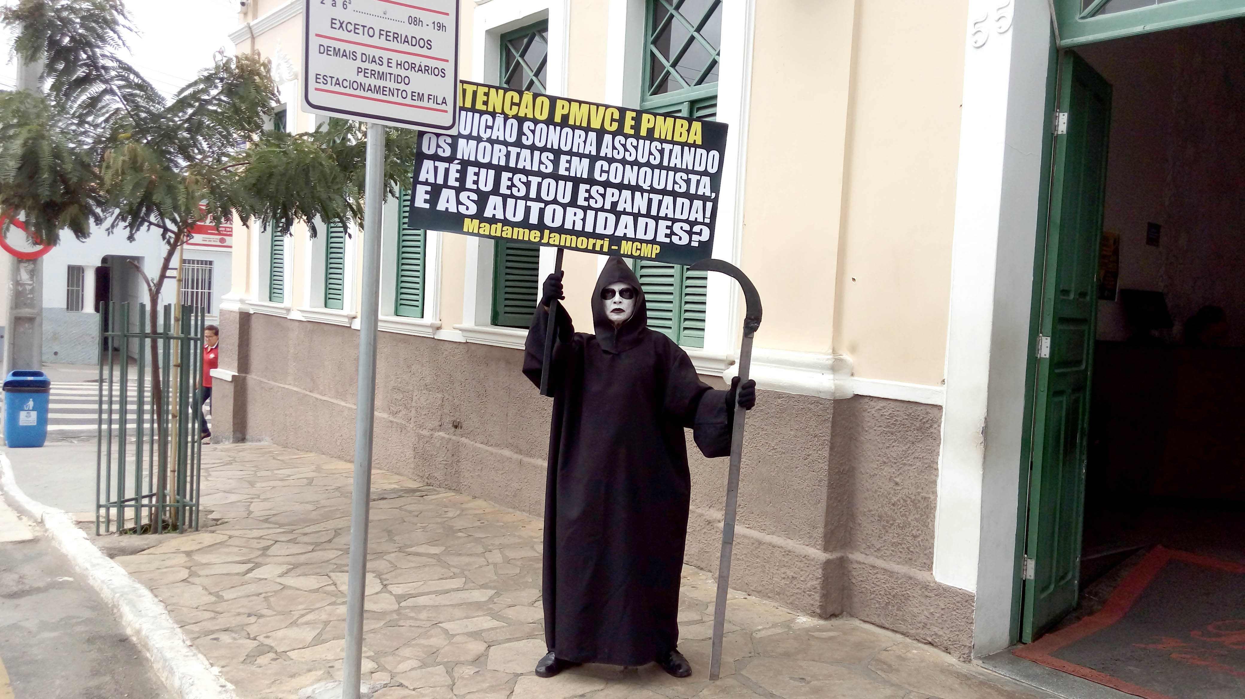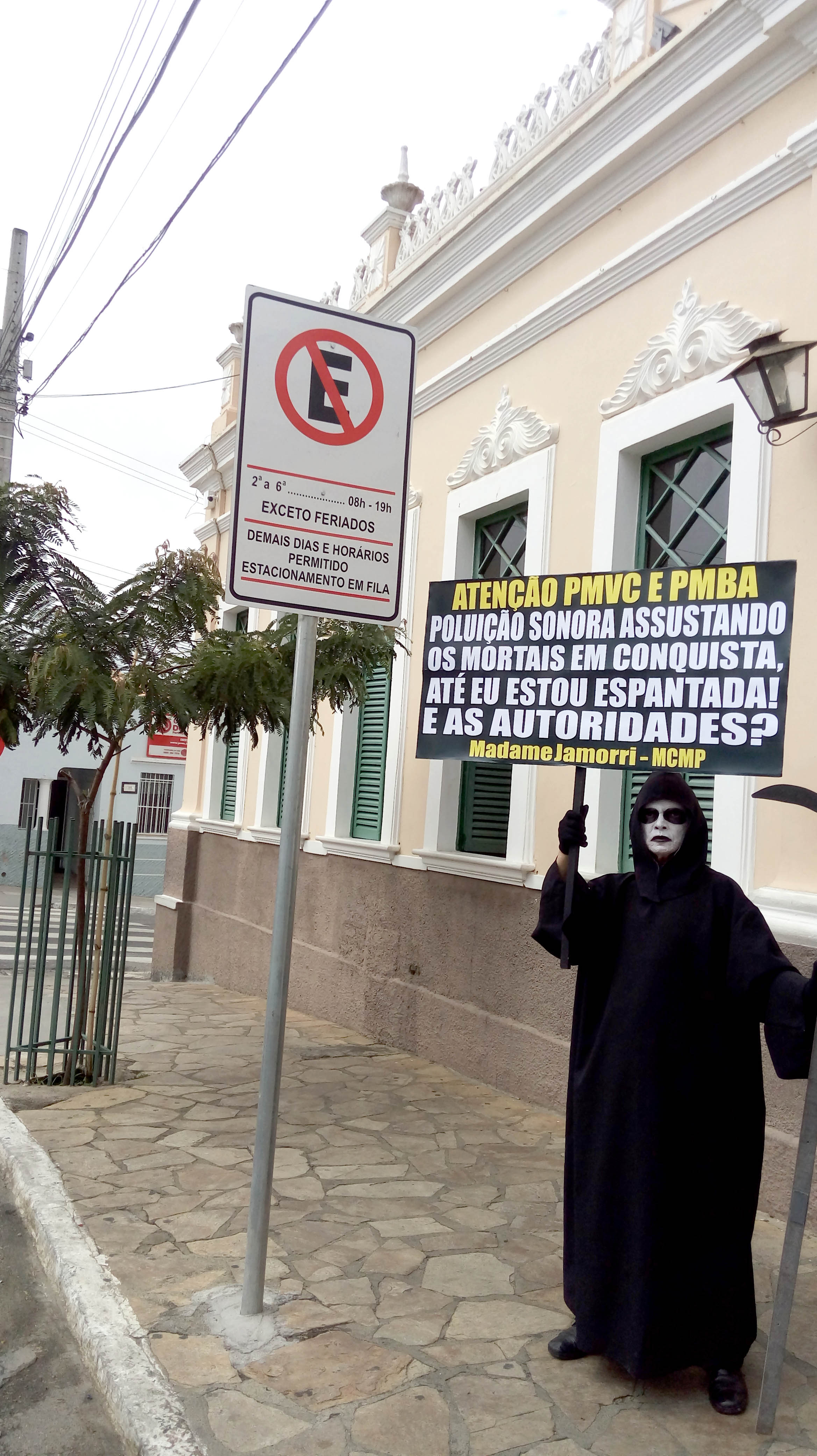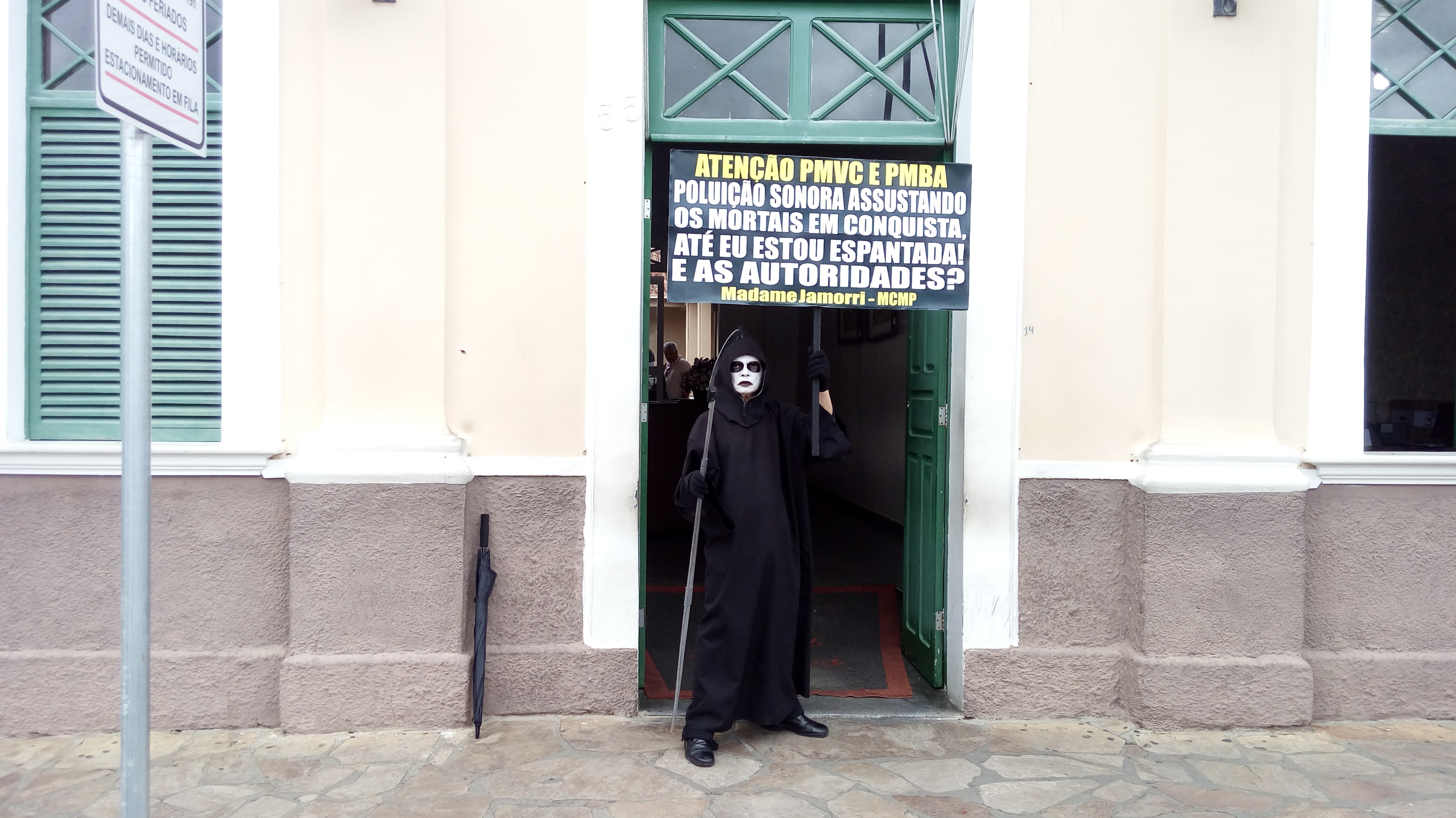 Questiona o Ambientalista e Presidente do Movimento Contra a Morte Prematura, André Cairo, em Protesto defronte a Prefeitura de Conquista, personificado de Madame Jamorri, espantada com tanto barulho na cidade, onde o MCMP cobra das Autoridades por mais de duas décadas, extinção de Perturbações do Sossego Público, em audiências com Prefeitos, Secretários, Ofícios, Tribuna Livre da Câmara, Manifestações, MP, Personagens e Imprensa, exigindo cumprimento das Leis em Eventos, Casas Noturnas, Veículos de duas e quatro rodas com sons estridentes e descargas livres ensurdecedoras, circulando livremente na cidade.