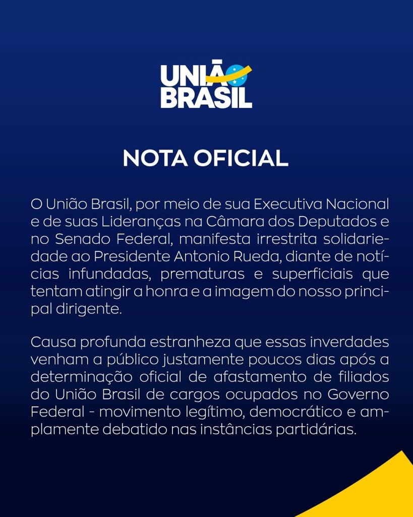 O União Brasil divulgou, nesta quinta-feira (18), uma nota oficial em defesa do presidente nacional da sigla, Antonio Rueda. No texto, o partido afirma que ele vem sendo alvo de “notícias infundadas, prematuras e superficiais”, com o objetivo de desgastar sua imagem e enfraquecer a independência da legenda. A decisão veio após uma reportagem relatar […]