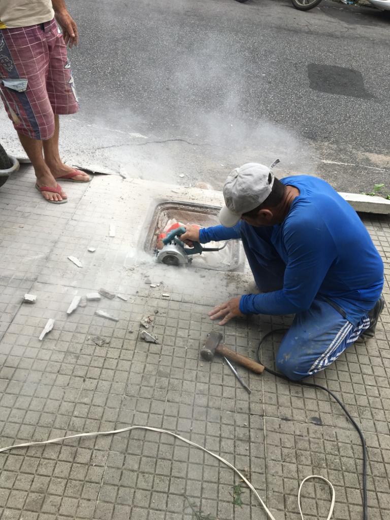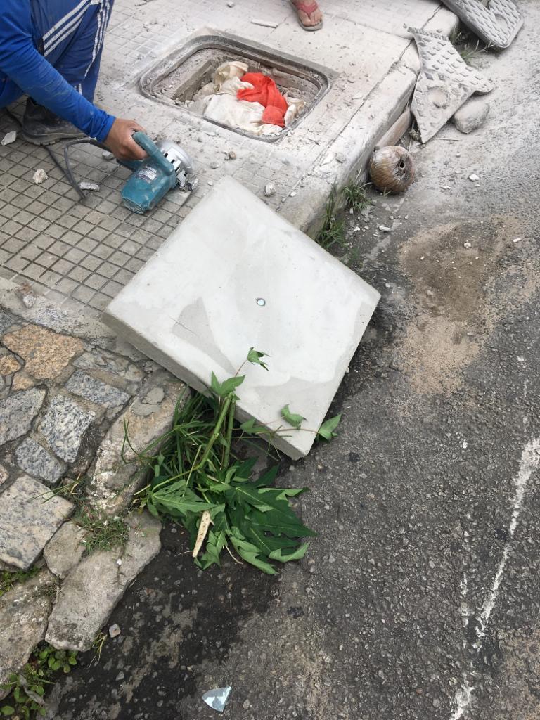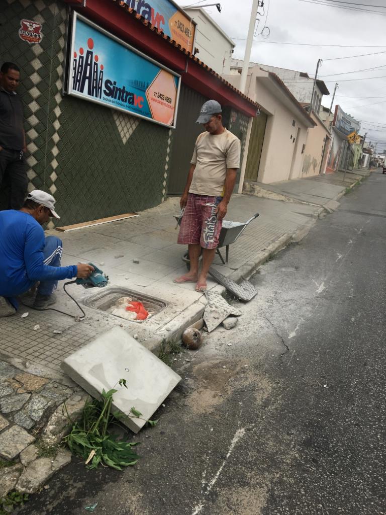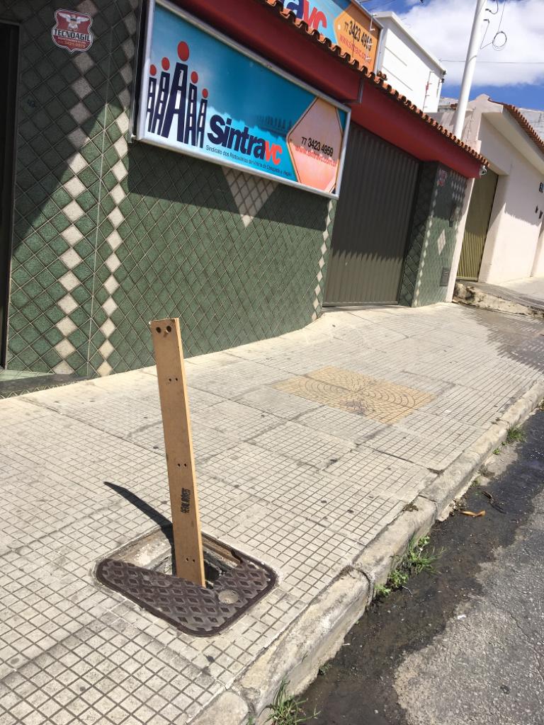 Depois de dias esperando a Empresa Baiana de Saneamento – EMBASA – atender uma ligação para consertar a tampa de um esgoto, a dona do imóvel resolveu ela mesma contratar um pedreiro e resolver o problema.
