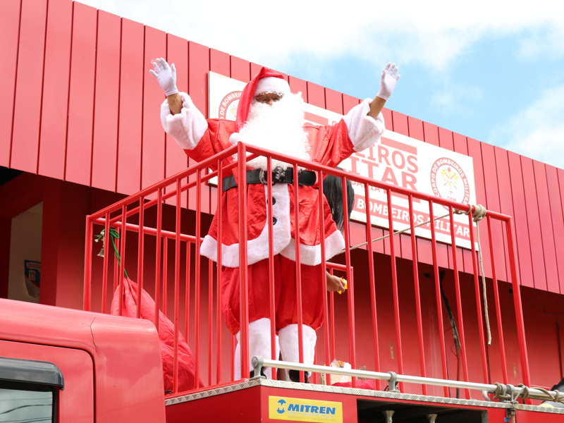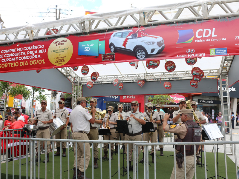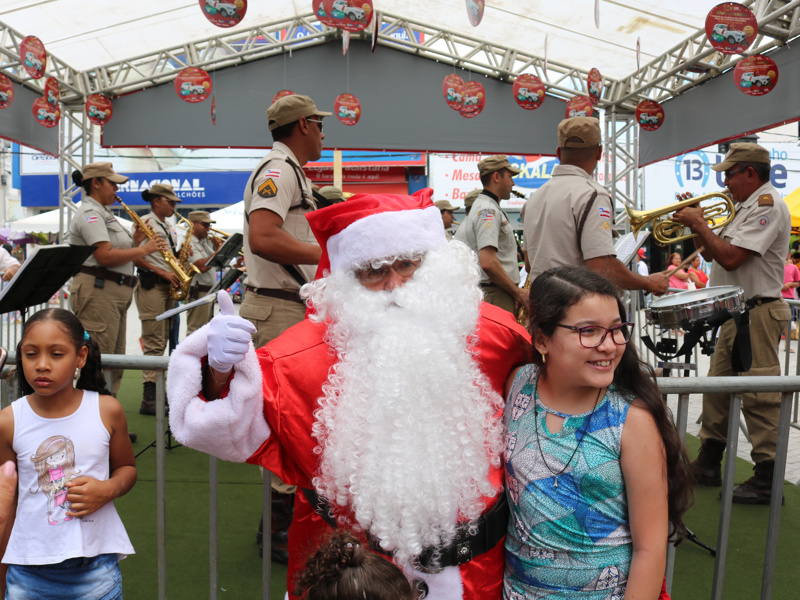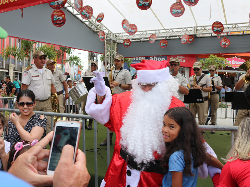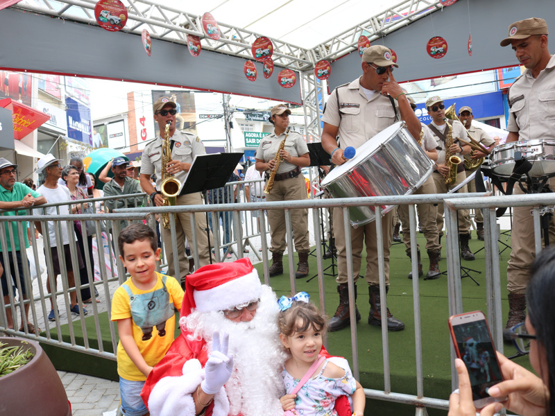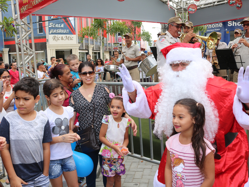 A chegada da carreata na Praça 9 de Novembro contou com a presença da Banda da Polícia Militar que animou consumidores que esperavam a chegada do bom velhinho.