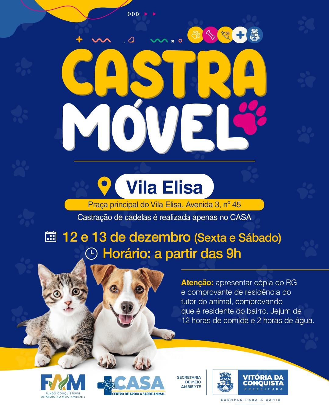 Nesta sexta (12) e sábado (13), o Castramóvel realizará atendimentos no loteamento Vila Elisa, bairro Espírito Santo. A unidade móvel do Centro de Apoio à Saúde Animal (Casa) realiza a castração de cães e gatos na praça principal do loteamento, a partir das 9h. Os tutores deverão comparecer com original e cópia do documento de identificação (RG) e comprovante de residência.