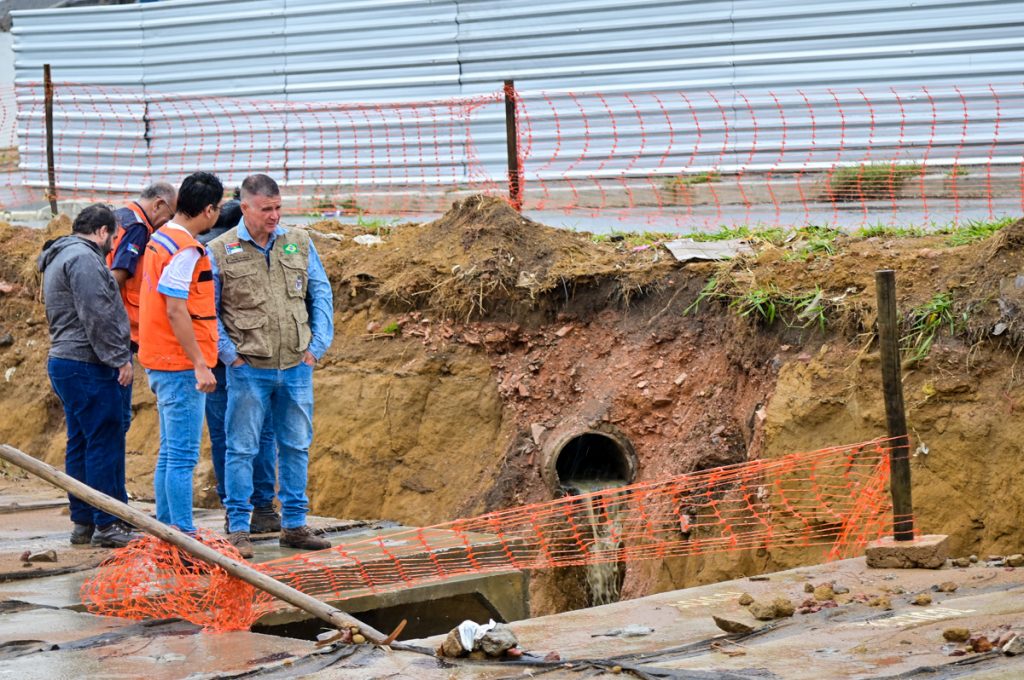 Equipes da Defesa Civil e da Seinfra vistoriam a obra da Av. Brumado