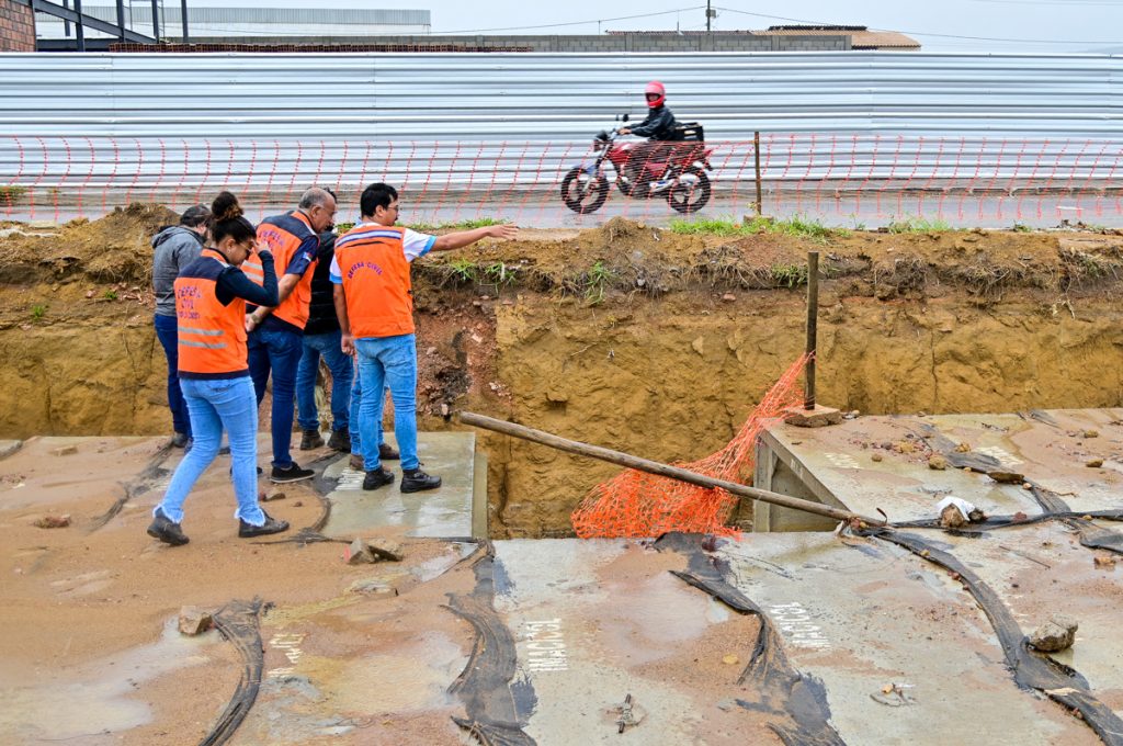 Equipes da Defesa Civil e da Seinfra vistoriam a obra da Av. Brumado