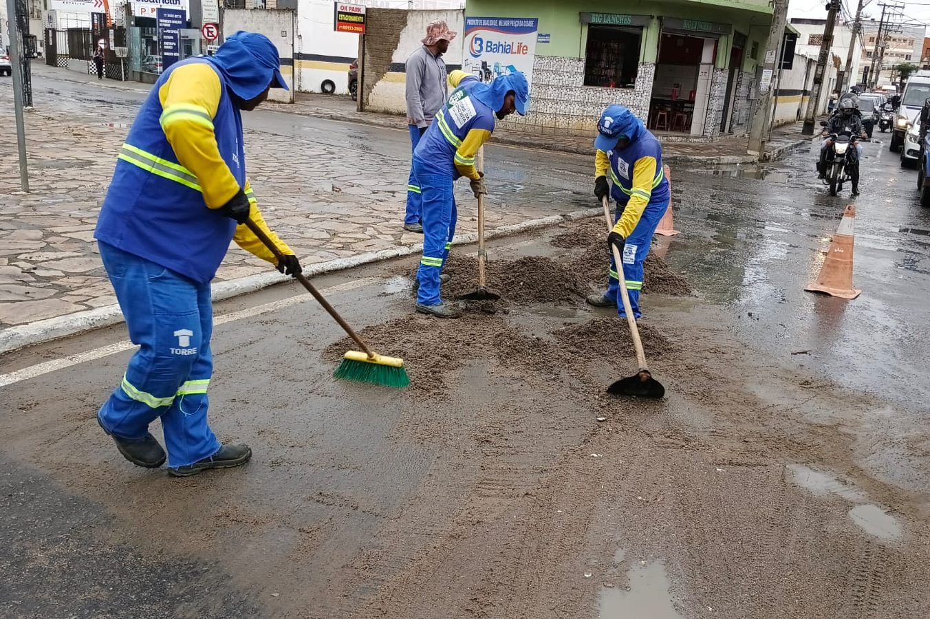 A Secretaria Municipal de Serviços Públicos (Sesep) atuou prontamente na Praça Sá Barreto e em um trecho da Avenida Brumado para retirada de terra, além de realizar a limpeza em frente ao Hospital Unimec.