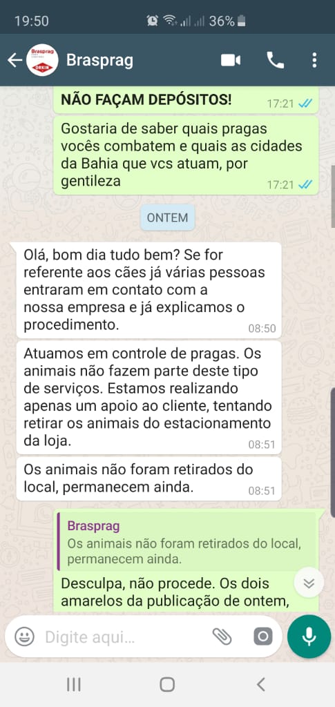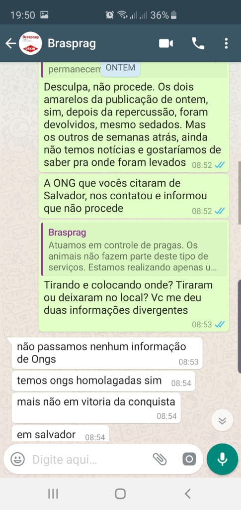 Confira os prints de um diálog pelo Whatsapp entre a integrante de uma ONG de defesa dos animais de Conquista e um funcionário da empresa Brasprag Orkin: