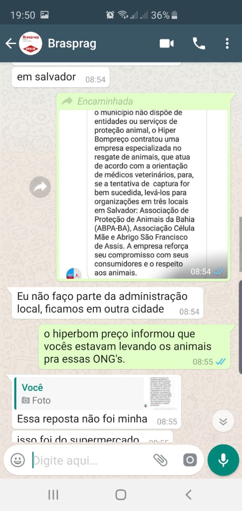 Na volta, decidi procurar o gerente do Hiper e perguntar sobre o assunto, pra ver se as respostas batiam. Fui recebido pelo Lucas, possivelmente um dos gerentes ou coordenadores. Ele me disse que a funcionária que sabia o nome da ONG não estava no momento, mas disse que os cães estavam atacando os clientes, e que eles procuraram o poder público e TODOS OS ABRIGOS DE ANIMAIS da cidade, e ninguém deu alguma resposta favorável, então contrataram uma empresa de controle de pragas, que levariam os animais a uma ONG em Salvador. Suas palavras foram mais ou menos assim: “a prefeitura disse não poder fazer nada, e que nós não poderíamos fazer nada aos cachorros, então contratamos uma empresa para isso”. Mais uma vez, quando perguntei o que essa tal ONG faria com os animais, a resposta foi parecida: “essa ONG é credenciada, legalizada”, sem responder o que perguntei. Saí de lá ainda sem saber o nome dessa ONG.