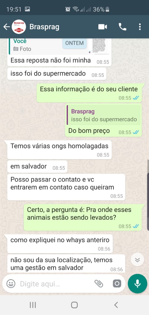 Ele disse que o Hiper Bom Preço havia contratado a empresa para levar os cães a uma ONG em Salvador, pois eles estavam atacando os clientes. Perguntei qual era o nome da ONG. Ele me disse não estar autorizado a dizer. Perguntei o que ela faria com os animais. Ele, ainda mais irritado, disse que é uma ONG credenciada, legalizada e que a empresa não sujaria o próprio nome, disse novamente. Observei as marcas em seu uniforme: ORKIN e BRASPRAG. Pesquisando, descobri ser uma empresa de combate a pragas que, na Bahia, atua apenas na capital (https://www.orkindobrasil.com.br/). Infelizmente, eu havia esquecido meu celular em casa, e não pude fotografar ou gravar nada.