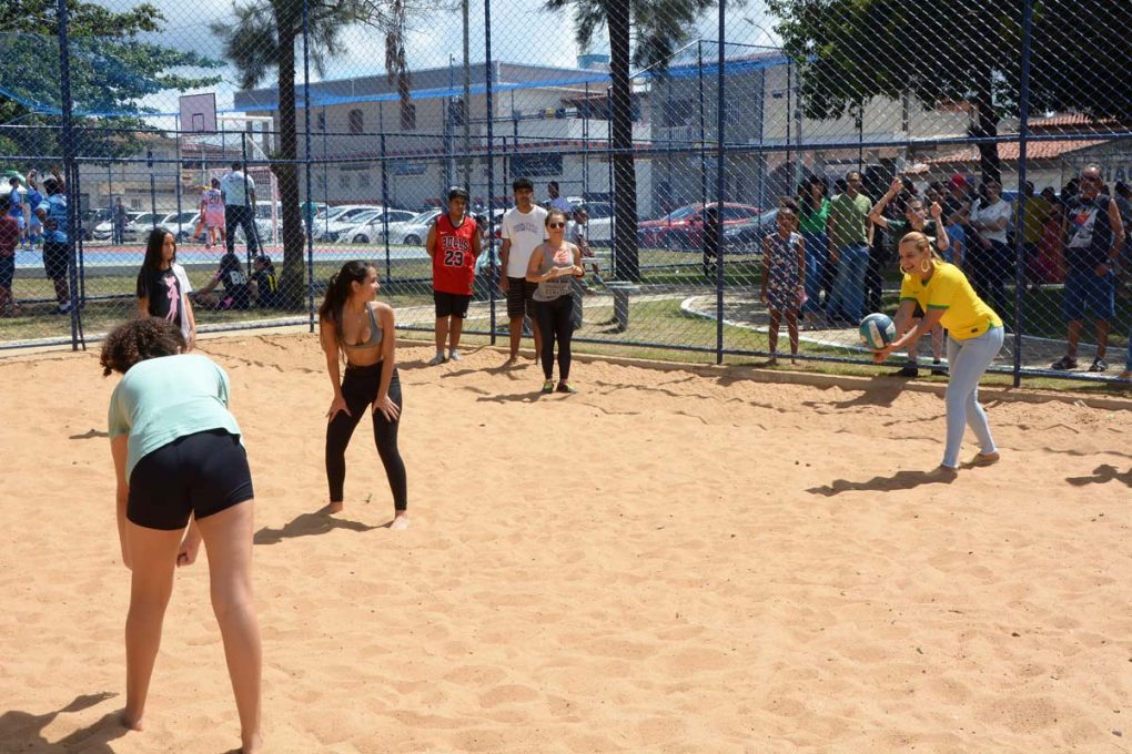 Além de dar um pontapé inicial do torneio de futebol feminino entre as equipes Coleguinhas (Ibirapuera), Revelação (Pedrinhas) e Mongóis (PMVC), a prefeita Sheila Lemos fez questão de fazer um saque no jogo de vôlei na quadra de areia onde serão realizadas disputas de vôlei e futevôlei.