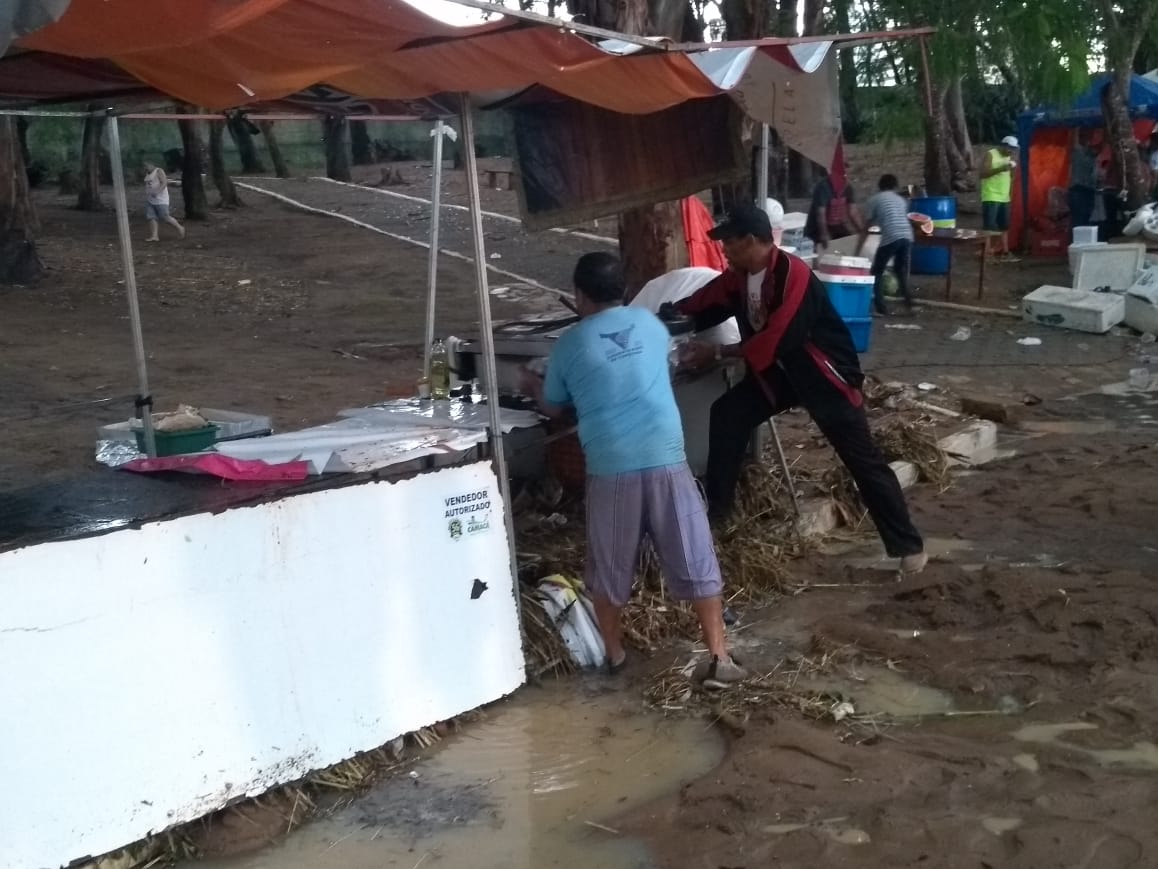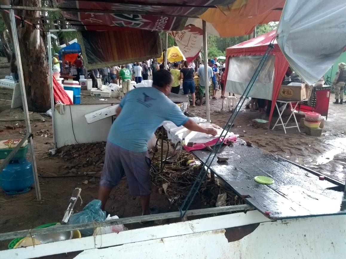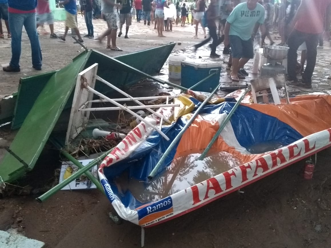 A chuva nesta tarde de domingo (17) deixou um rastro de destruição em vários pontos de Vitória da Conquista. Dentro do estádio Lomanto Júnior, um muro foi derrubado e a enxurrada invadiu a arquibancada e destruiu também as barracas dos ambulantes que comercializando dentro do estádio. O autônomo conhecido como ‘Bililique’, que há mais de 20 anos sobrevive como ambulante perdeu toda a mercadoria e teve sua barrava destruída. “Na hora que caio muro, a enxurrada veio com tanta força que se tivesse uma criança aqui teria morrido, levada pela enxurrada.