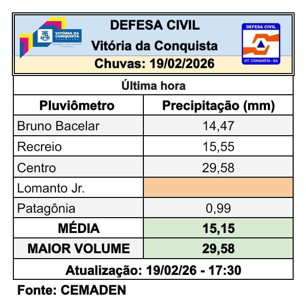Dados do Centro Nacional de Monitoramento e Alertas de Desastres Naturais (Cemaden) indicam que o Centro foi a área mais afetada, com registro de quase 30 mm de precipitação em curto intervalo. Outras localidades como Recreio (15,55 mm) e Bruno Bacelar (14,47 mm) também apresentaram volumes significativos, resultando em uma média municipal de 15,15 mm.