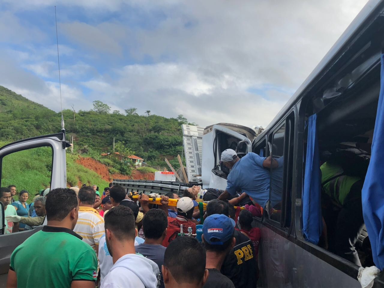 O fato ocorreu no Km-719, na BR-116, trecho que corresponde à cidade de Manoel Vitorino, sudoeste da Bahia, na manhã desta sexta-feira (16). O motorista do caminhão está morto, preso às ferragens. Os sobreviventes estão sendo atendidos no local por equipes do SAMU de Jequié e Poções e ainda a ajuda da Via Bahia. Três adultos e uma criança foram socorridos para o Hospital Geral Prado Valadares, em Jequié. Outros passageiros são atendidos no local. A pista está interditada nos dois sentidos.