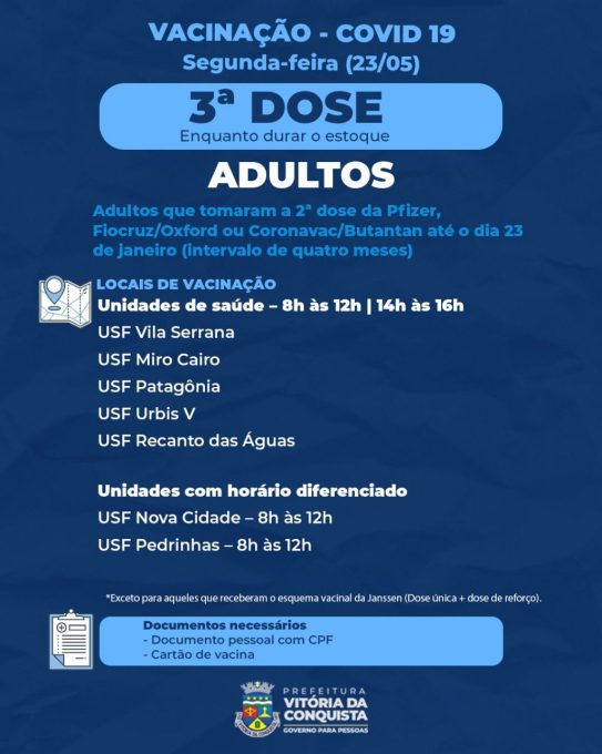 Adultos – Para quem tomou a 2ª dose até o dia 23 de janeiro, a 3ª dose estará disponível nas unidades de saúde Vila Serrana, Miro Cairo, Patagônia, Urbis V e Recanto das Águas, nos dois turnos. Nas unidades Nova Cidade e Pedrinhas, a vacinação ocorre apenas pela manhã, das 8h às 12h.