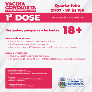 A vacinação com 1ª e 2ª doses será retomada nesta quarta-feira (21) em todos os oito pontos fixos da cidade. A aplicação da 1ª dose será para a população geral com 42 anos ou mais, gestantes, puérperas e lactantes maiores de 18 anos. Já a aplicação da 2ª dose da vacina AstraZeneca/Oxford será para as pessoas com data de retorno marcada para o dia 22 de julho ou datas anteriores.
