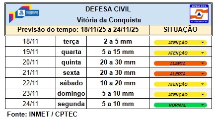 O Instituto Nacional de Meteorologia (Inmet) emitiu, nesta terça-feira (18), dois alertas amarelos para Vitória da Conquista: um para tempestades e outro para chuvas intensas, abrangendo as zonas rural e urbana.